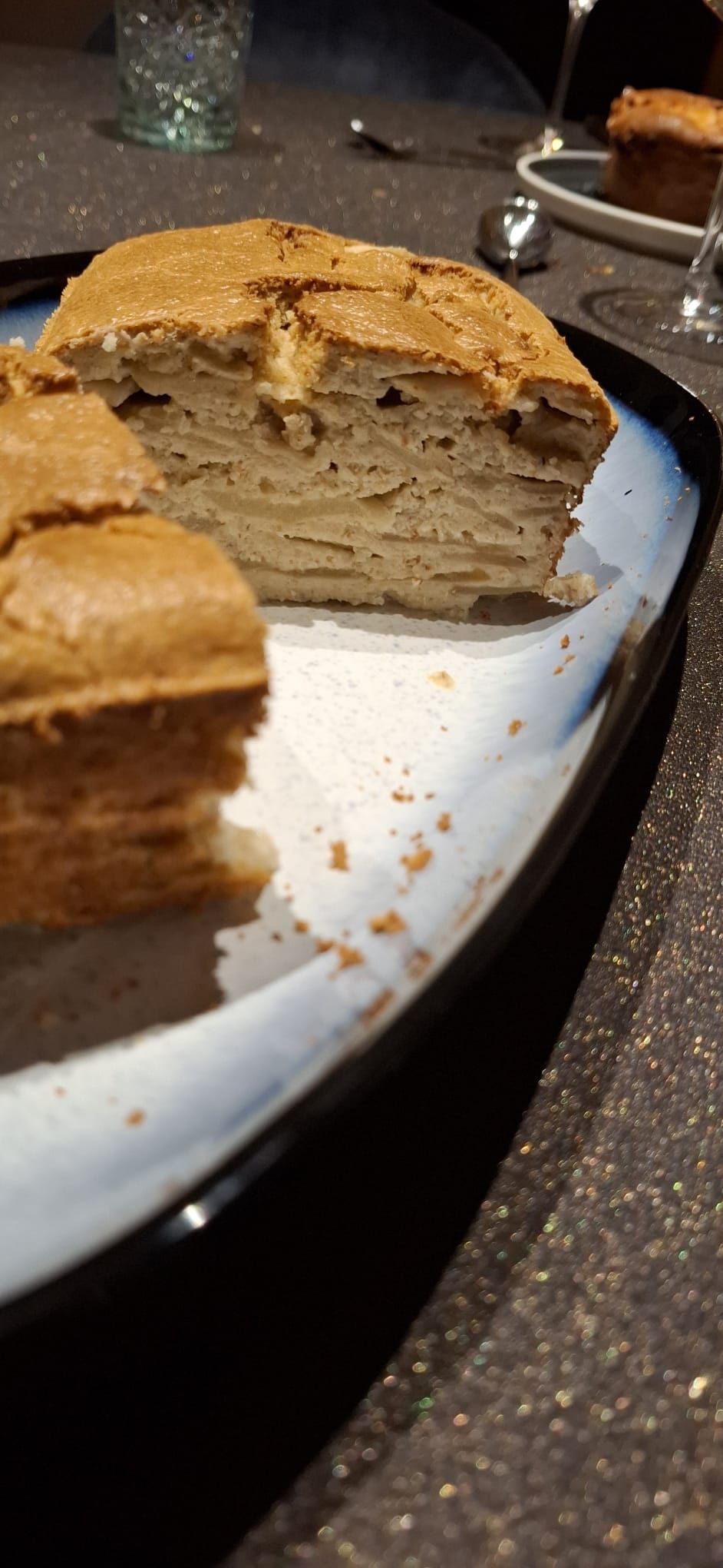 - Maak laagjes zoals bij een lasagne: beslag afgewisseld met schijfjes appel.
