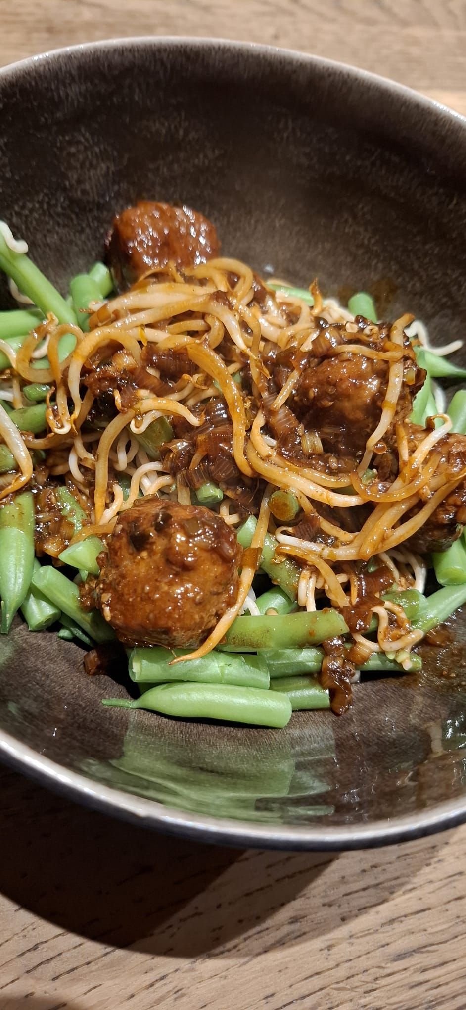 - Schep de sticky gehaktballetjes met saus over de noedels.