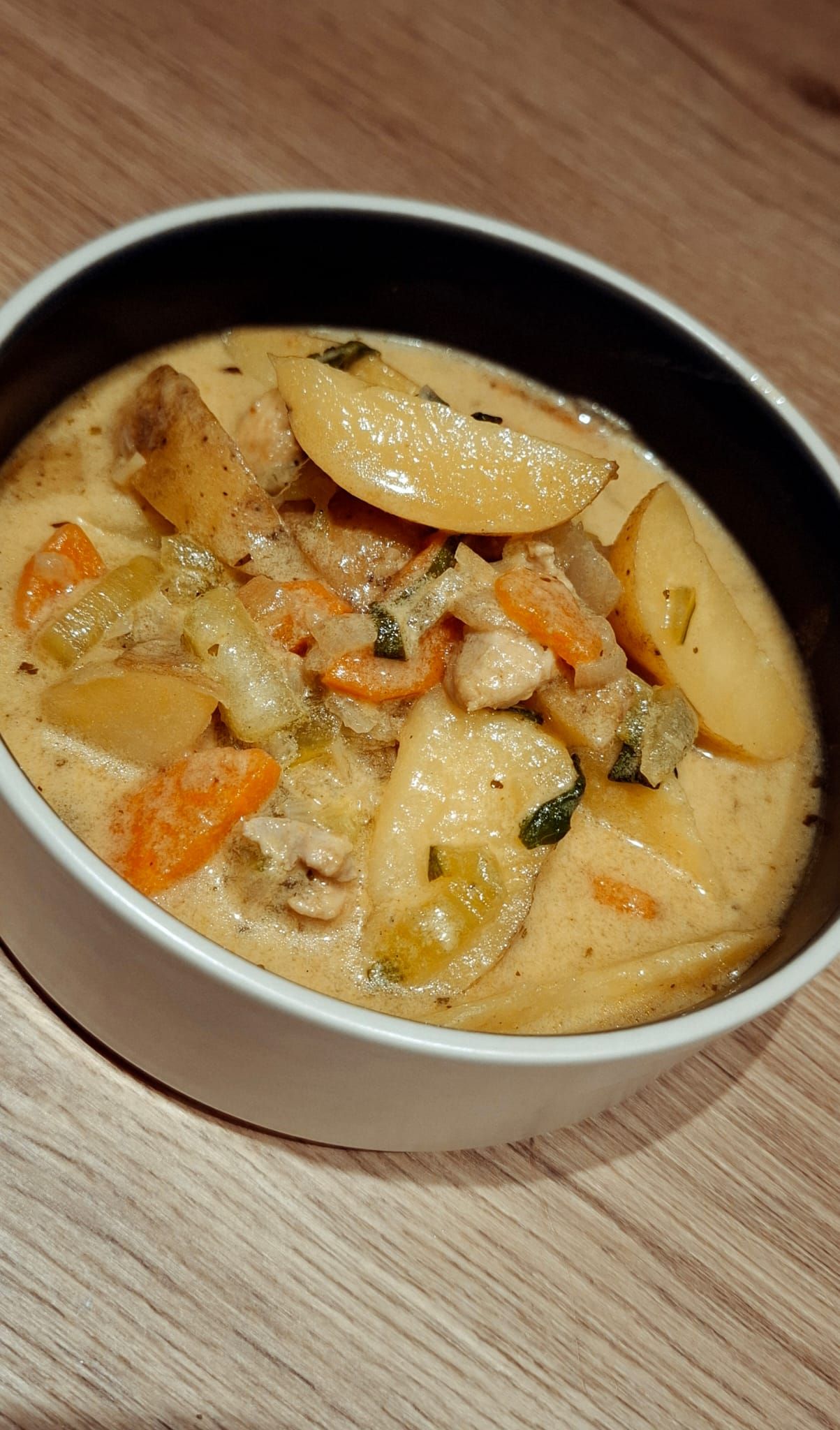 - Snijd aardappel, wortel, sjalotten en kip.